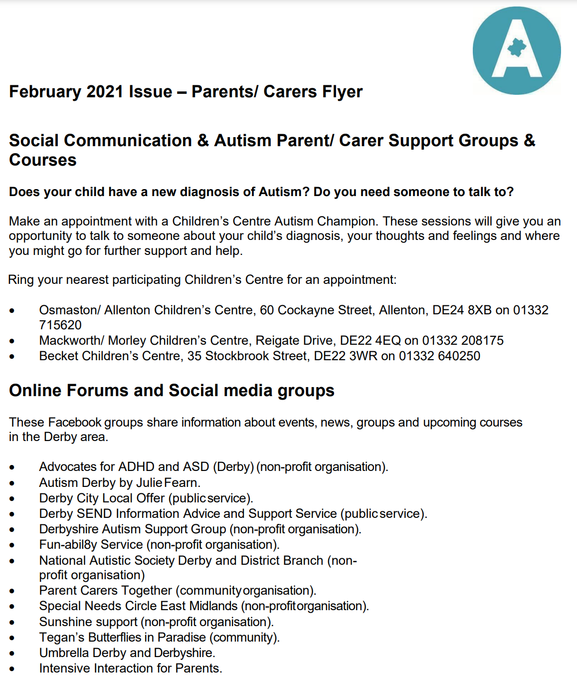 Derby SENDIASS - provides free, legally-based impartial, confidential and accessible information, advice and support for children, young people and parents/carers covering SEN, Disabilities, Health and Social Care.